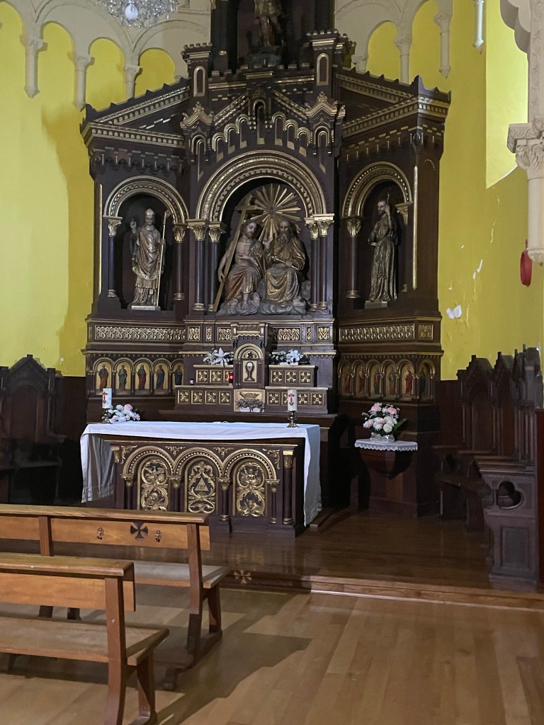 Stopped at an abbey for a stamp in our Camino passport. Got the stamp but could not enter abbey. Found a little church later. Beer not in church; that’s in Pamplona.
