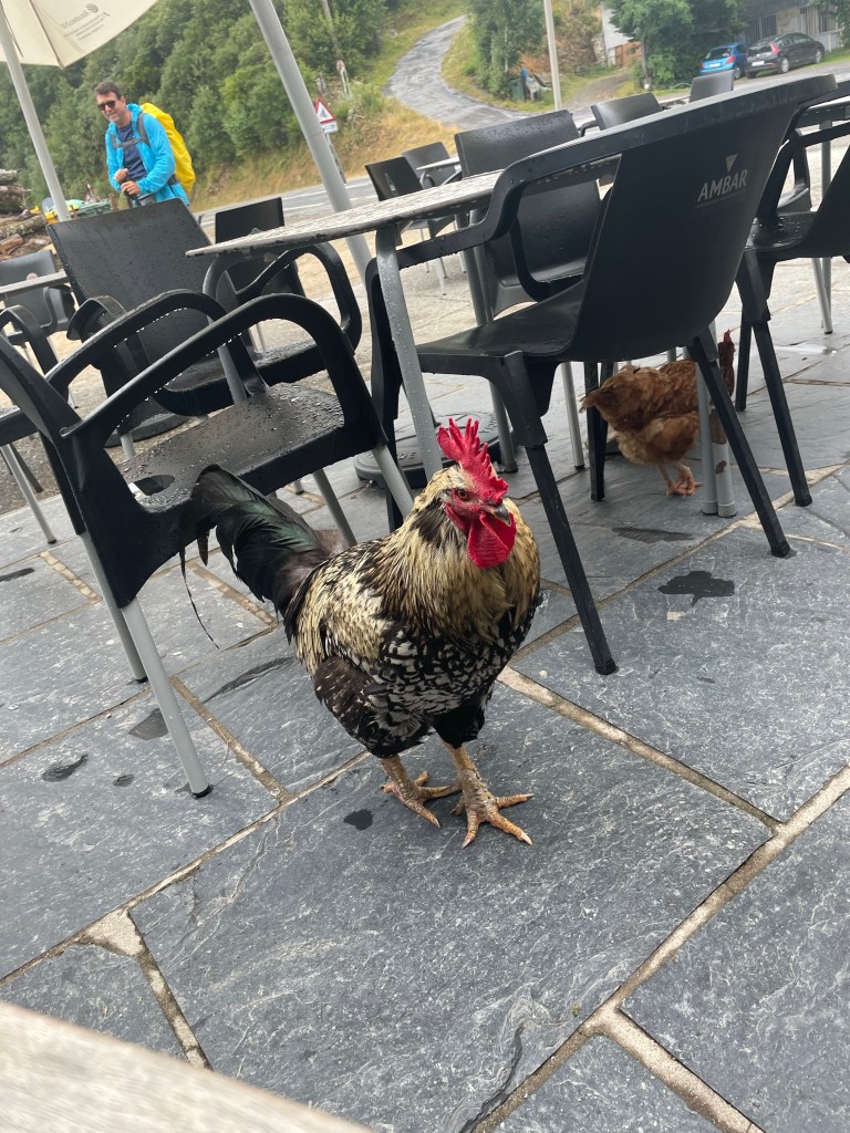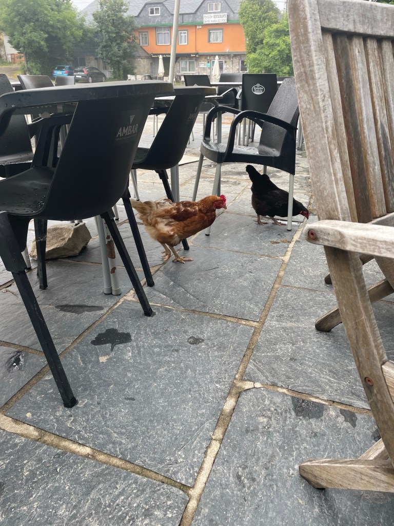 After a particularly tough hill, we landed at a bar for a drink and snack for Caleb. Unfortunately, there were loose chickens and a giant rooster. I am terrified of chickens , and the rooster sent me running inside the bar. I am not a fan of fowl.
