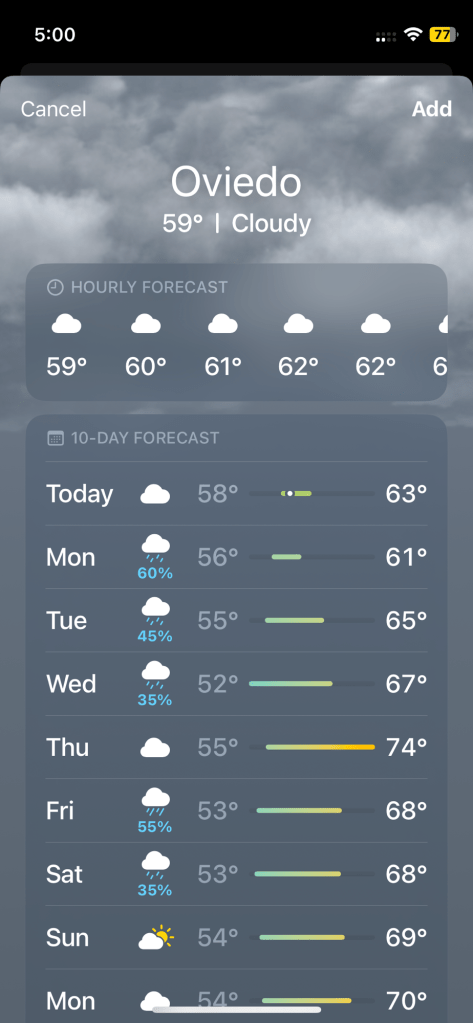 I’ve checked the weather in Oviedo and I may revisit my clothing choices. The two previous trips have provided warm to quite hot weather. From what I just saw, it may be a bit cooler. So, maybe a a couple pair of lightweight pants will replace shorts for cooler evenings.