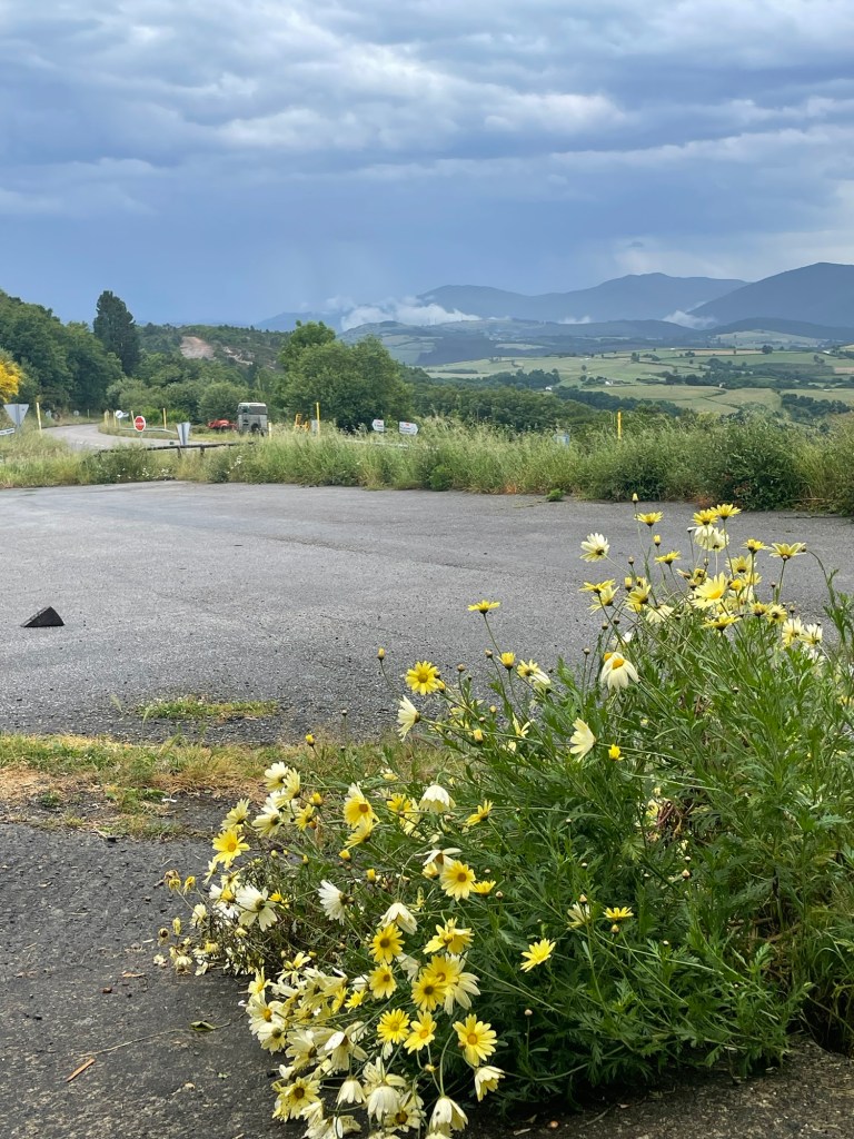 Today was a mixed bag of fantastic weather in the mid 70s and pretty level walking, then torrential rain and steep climbs and descents.