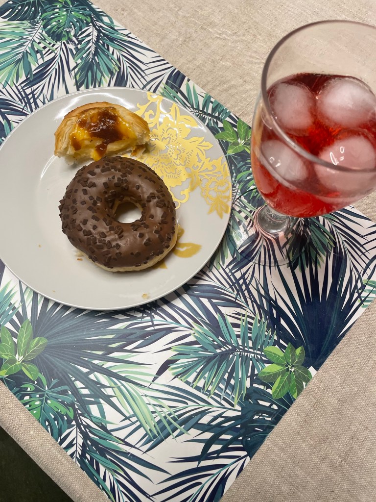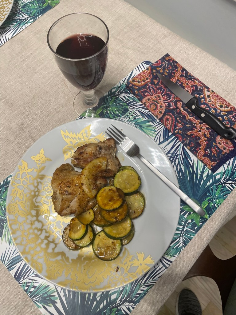 Caleb is spreading his culinary wings and cooked us a fantastic dinner – chicken thighs with lemon, zucchini in the chicken renderings. Donuts for dessert and a shared flan.
